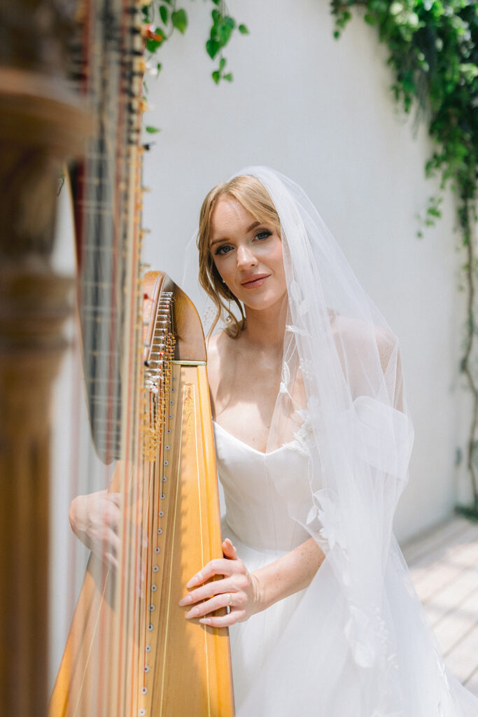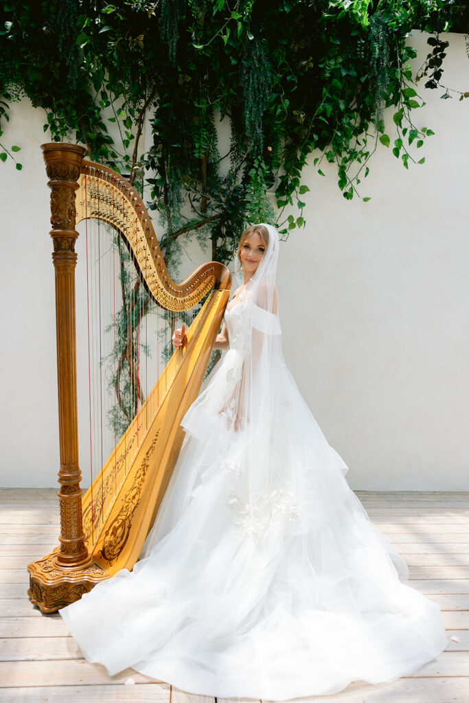 Nestled among lush greenery and soft natural light, the venue provided an ethereal backdrop that felt both editorial and organic. The glass architecture allowed sunlight to gently wrap around every detail of Gabriel’s gown, veil, and bouquet, creating a dreamy atmosphere that highlighted her natural grace. The soft whites, muted greens, and delicate textures of the space complemented the classic and romantic aesthetic she envisioned – clean, elegant, and truly timeless.