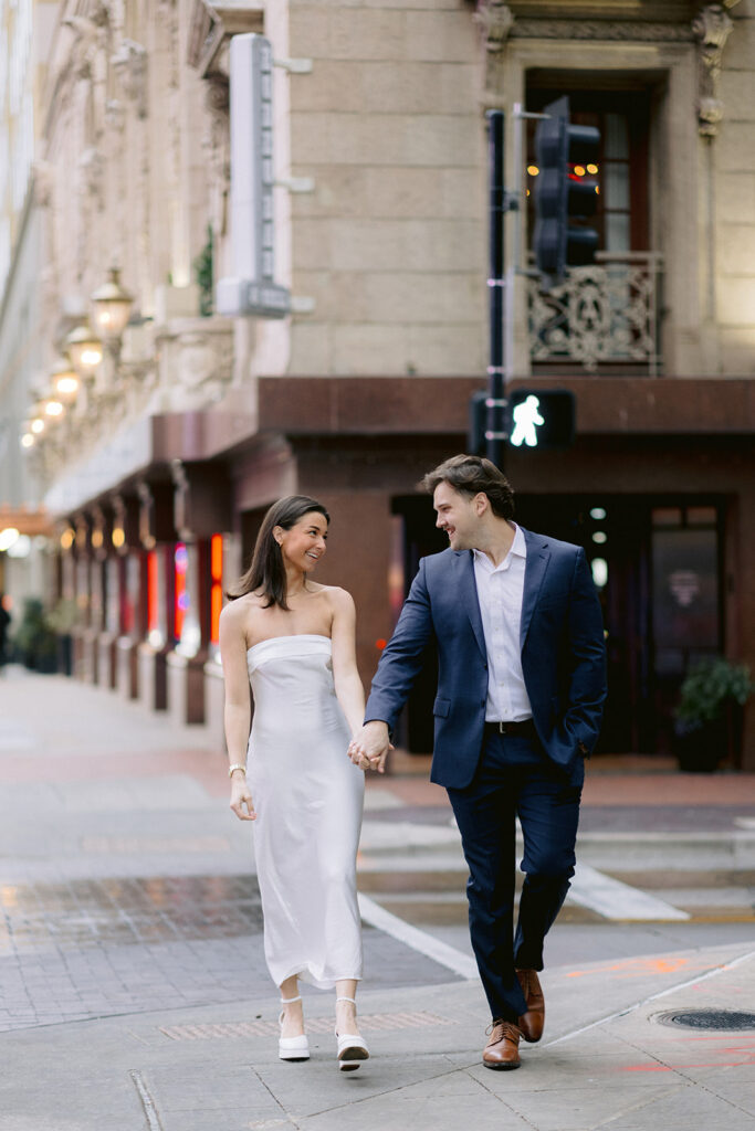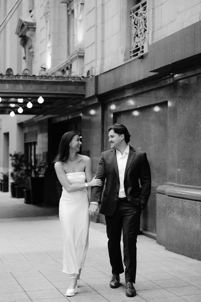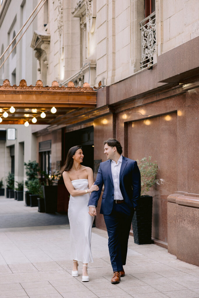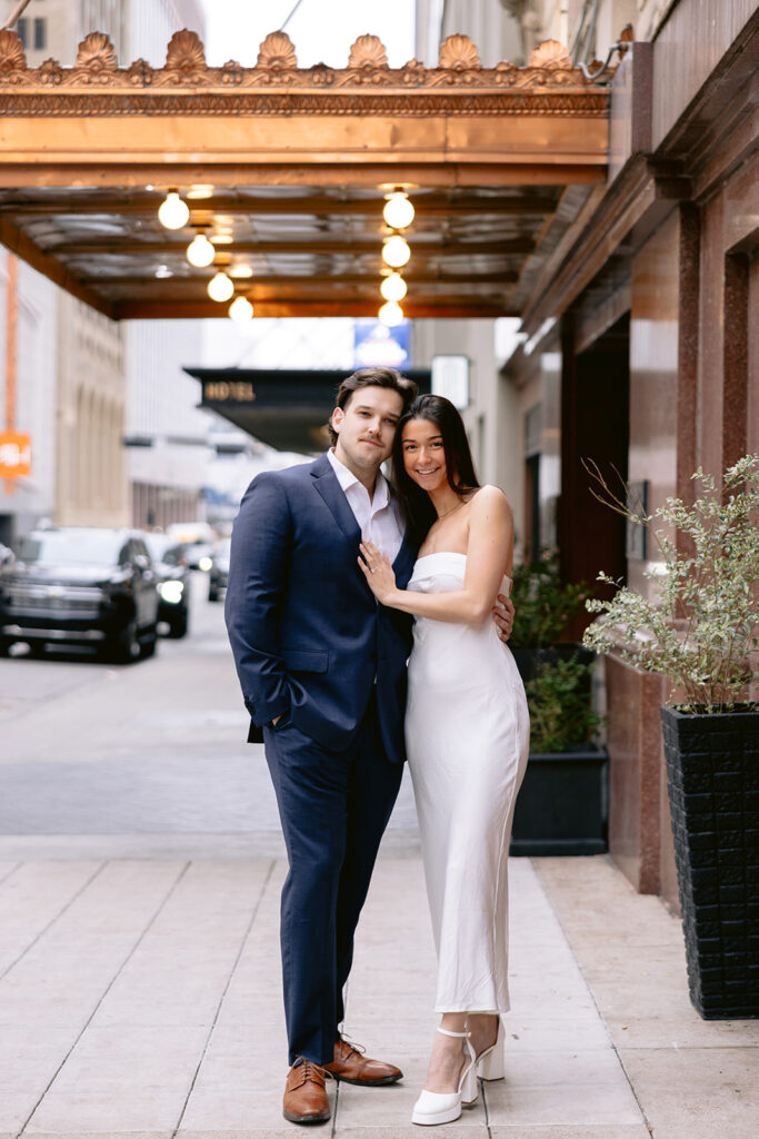 The city setting added a sophisticated and editorial feel to their engagement photos. Classic architecture, soft evening light, and the energy of downtown created the perfect backdrop for a session that felt both timeless and modern. The contrast of urban textures with their soft, romantic connection made each image feel cinematic and elegant.