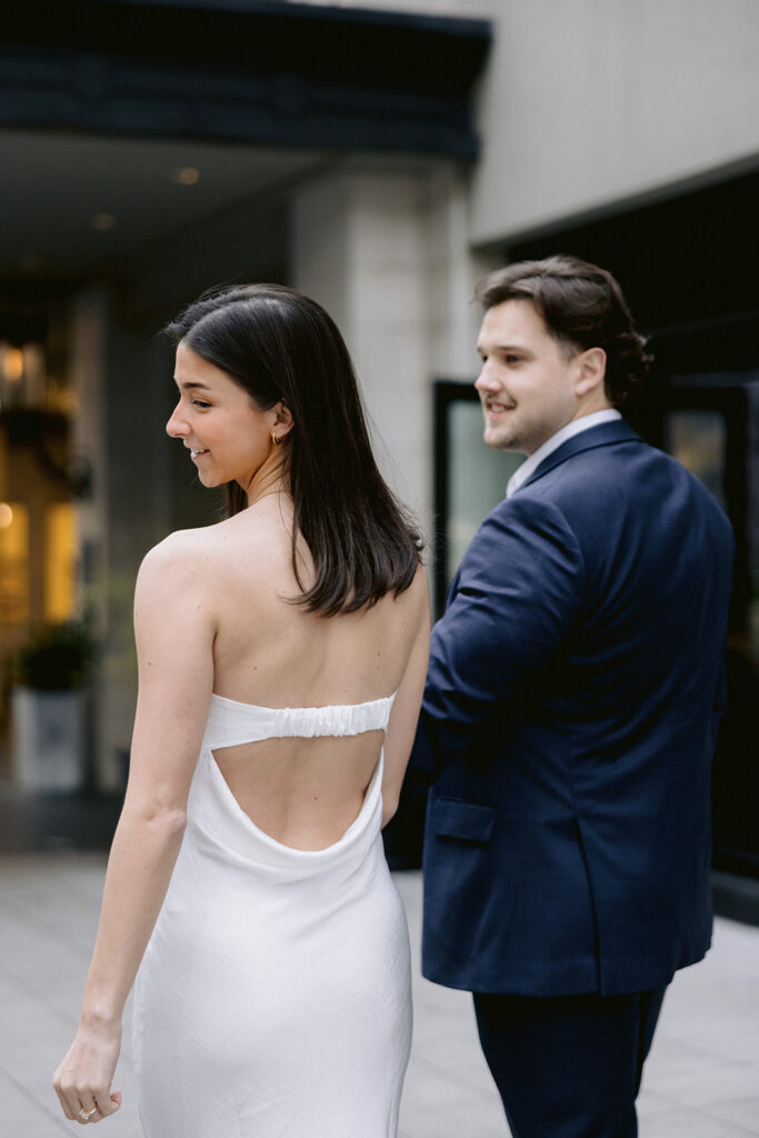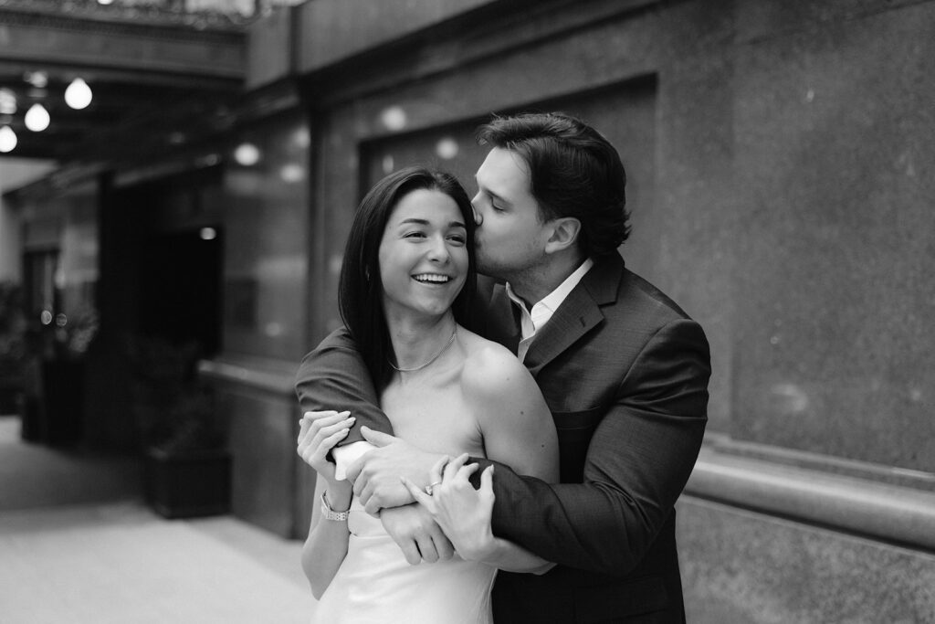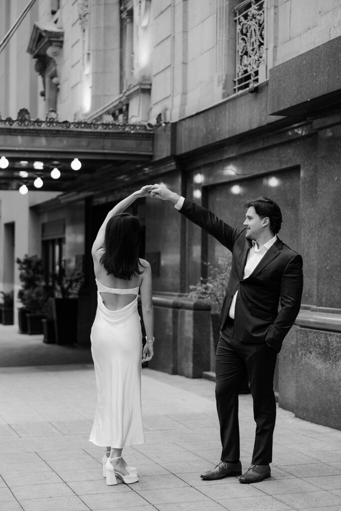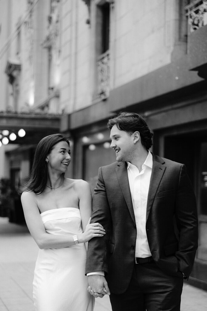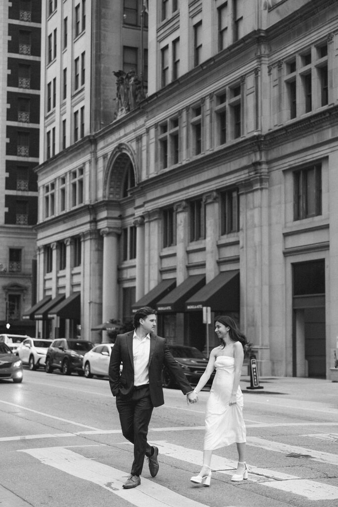The city setting added a sophisticated and editorial feel to their engagement photos. Classic architecture, soft evening light, and the energy of downtown created the perfect backdrop for a session that felt both timeless and modern. The contrast of urban textures with their soft, romantic connection made each image feel cinematic and elegant.