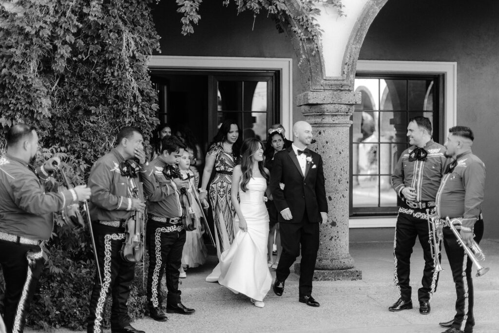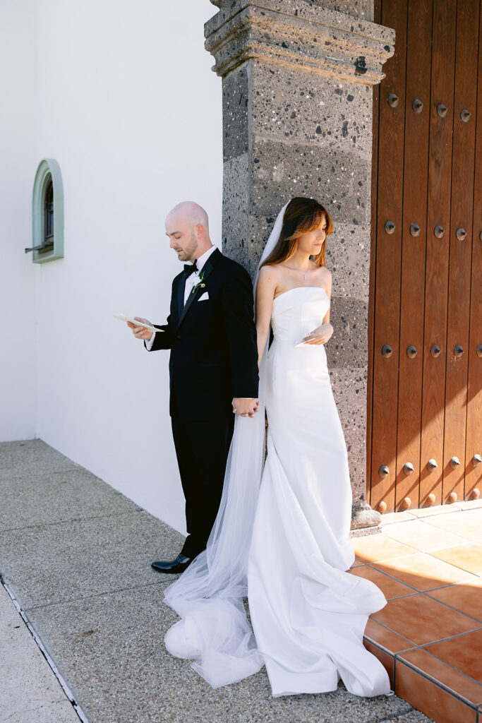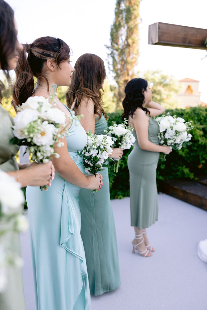 The ceremony unfolded overlooking the rolling hills beyond the villa, where soft light wrapped around the couples as they exchanged vows. The setting created a peaceful, almost cinematic atmosphere – one that felt quiet, sacred, and deeply intentional. Spanish – inspired architecture framed every moment: the arches, the stone textures, and the open sky beyond them. These elements worked together to create imagery that feels timeless rather than trend – driven. A signature of the refined, documentary – editorial style I bring to each wedding I photograph.